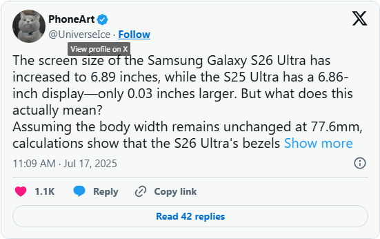 According to reliable leaker [UniverseIce](https://x.com/UniverseIce/status/1945682162654802010), the Galaxy S26 Ultra will shrink its bezels down to a mere 1.15mm—so thin they’ll appear almost invisible. Despite the slimmer borders, Samsung is expected to keep the phone’s overall dimensions similar to past Ultra models while fitting in a slightly larger screen.