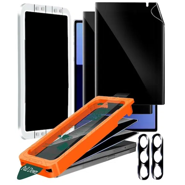A budget-friendly choice that doesn’t skimp on features. This set includes three front-screen protectors with privacy technology that prevents others from seeing your screen from the side. It also promises high transparency and 9H hardness. You even get three camera lens covers—great value for under $10.